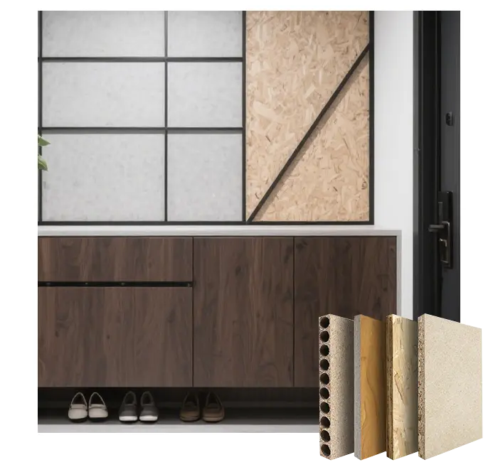 Particle Board is an engineered wood product made from wood chips, sawdust, and resin pressed into sheets under heat and pressure. It features a smooth surface, lightweight structure, and cost-effectiveness, making it suitable for furniture, cabinetry, shelving, and interior decoration. Although less durable than plywood or MDF, it is widely used for its affordability and versatility.